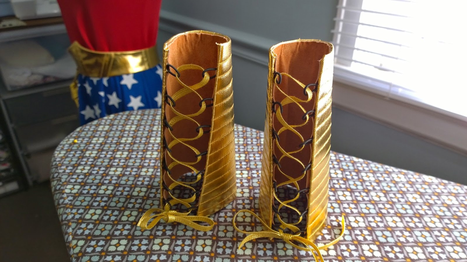 In the meanwhile, I made the accessories. Right away I rejected the idea of copying the eagle over Wonder Woman's boobs, reasoning that, without that element, the dress can be worn on the Fourth of July or another patriotic occasion. Also, for crying out loud--too much work!